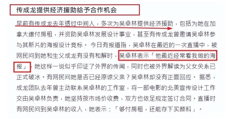 随着时间推移,成龙对这位从未正式承认的女儿态度逐渐软化。他通过第三方人士多次给予吴卓林经济支持,不仅帮忙支付加拿大的房租,还在职业发展方面提供实际帮助。